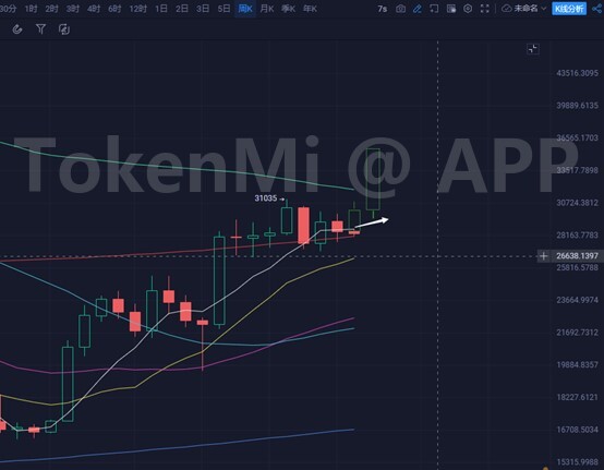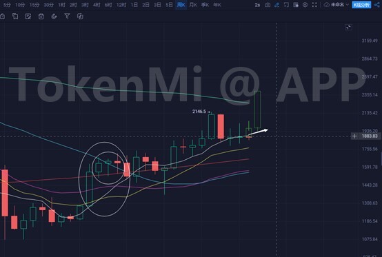 大饼的周线大致就这么个走法,想要跌概率不大,通常是形成上升型的两阳夹一阴就可以,下周可能会有暴涨,本周暴涨概率不大。而这一点其实大饼本身没有给出答案,也就是并不清晰。相反以太坊这几天幺蛾子多,包括周末也是它幺蛾子下来的,但反而信号更明显一些,就是做镜像:
