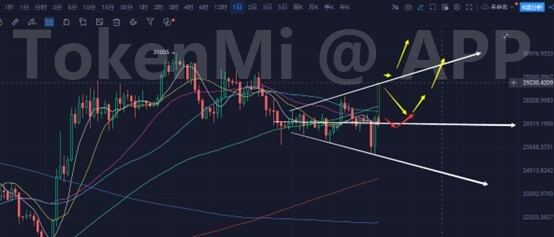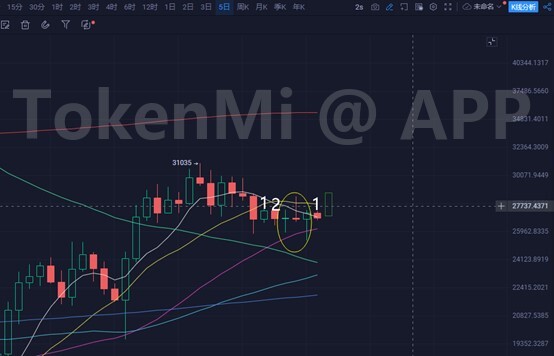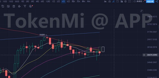 和5日线同理,如果玩震荡,可以昨天长下影为中心,组成3K,那么下一个K线才能涨。也可以当下这根线就涨阳线实体去28000上方。前者是配合5日线玩震荡,后者则是走小概率当下5日线拉盘路径。
