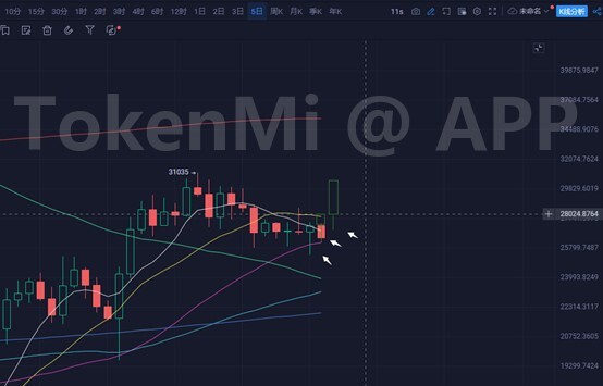 比如周线,和此前的记忆唤醒还是高相似状态,周末虽然拉盘极为困难和少见,但并非不可能。最低需求形成两阳夹一阴会稍微好点,这样的话实体需要收在至少28000上方才行,否则下影线 太长实体太小,下周又是个麻烦。如果能两阳夹一阴,那么下周略微回踩黄色14线后就可以去挑战绿色86线大约3字头了。这种走势就需要5日线配合: