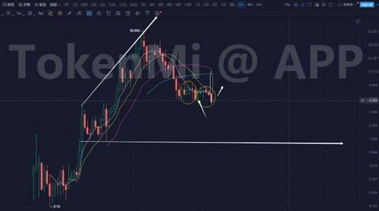 这一脚位置大约在1620-1680之间,这是因为880美金反弹以来这货的数字规律区间就是这样的,黄色14均线在大约1620位置。这几天也是以太相对偏弱,和我们上周讲的以太反而没有回调欲望甚至有拉盘欲望刚好相反,而之所以会这样,一是SEC到处挑选加密货币动不动就说人家是证券,以太自从pos机制后就一直有这种说法。二是V神曾表态如果不是layer2的发展,以太有失败可能。这两点对于短期以太的走势影响较大。所以以太接下来会不会去踩这一脚就直接影响市场整体短期的强弱。但这个区域是可去可不去的地方,没有标准答案一定去或者不去,留下呼吸口或者不留都行,无法提前判断。所以当下对于短线合约是不友好的,但对于现货,只要确定了方向,其他的都不重要。周末的一笔下跌20-30%很多人受不了,但是这是加密货币市场,山寨的波动率这已经算是非常常规的了,长时间小波动横盘才是非常规,不能因为我们已经习惯了他们没波动震荡的异常状态就觉得大波动正常状态很奇怪而产生应激反应,更不要因为一时的下跌就否定山寨的价值(以小博大的投机价值)。基于SEC事件发展的不确定性,和技术形态驱动的相对确定性,合约风险较大,现货比较安全,少折腾为好。