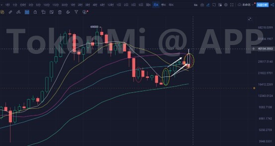 周六市场并没有基于并列线上行,反而是向下运动。而这一现象的发生,就是典型的事件驱动——SEC针对某安和coinbase导致一些持仓的机构(尤其是交易所型和做市商型)担心挨揍选择先退出观望导致的大量抛盘突然涌现。这种事件驱动的行情后续走势只能根据事件的进展来马后炮式分析,对我们操作而言意义不大,而且依旧扑朔迷离,不如不去纠结。回到金融市场K线的本质容纳并消化一切信息,市场才有一定框架内的分析价值。