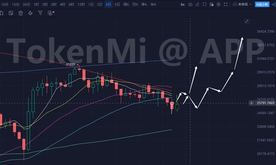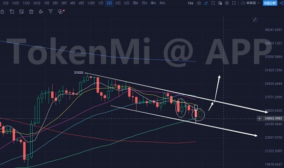 2日线明早收,时间还多形态未定,但对于多军来说只有两种是相对好的,第一种就是幺蛾子模式,继续下坡绿色86线,但最终会形成一根超长下影的针,然后利用这根针诱空,极限不能破23800美金,破则危。另一种则是今天波动不大就保持阴线实体较大收尾,那么下一个K线可以做类似并列线效果反弹。