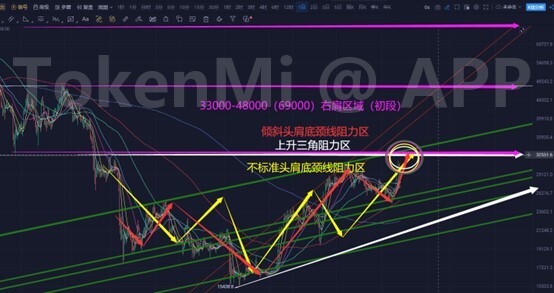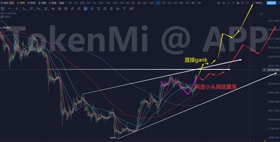 快的方式下,那么市场三季度就可能刷新历史高点,因为二季度是一个相对实体阳线大约到35000-36000一线。慢的话,则如上图所示,二季度K线会适当的回缩一点点形成实体非常小的十字星,三季度则还会是一个小幅度波动的阳线,直到四季度市场才有刷新历史高点的可能性。两种方式来说都可以有,也都合理。两种路径的区别只有一个,那就是三季度是否是山寨的爆发期,如果是那么三季度市场就要为山寨营造环境,大饼以太就不适合继续强攻,只需要相对稳定即可。如果不是,那么大饼以太就可以继续上攻,而山寨的爆发期就不会特别明显,也就是以往经验就有一定的变化。不管哪种方式,都需要大家多一些耐心。而且需要注意的是,以上只是基于目前情况做出的技术形态的衍变模拟(而且是多头角度算是多军幼想),所以可以作为参考,但不能偏听偏信。对于空方来说的话,不需要考虑这么多,只需要砸盘就完事儿了。我个人倾向来说,虽然希望市场越快越好,但市场往往会选择比较慢的方式,两种方式总结到日线图大约就是下图的路径选择问题: