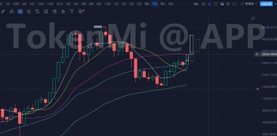 月线上有快慢两种情况,快的话本月剩下时间还将继续上攻,整体形成月线三叠浪(我瞎取的名字,不要较真),那么7月就必然还是大阳线,甚至可以顺势突破至5W-5.4W美金区域,这种走势要求6月的阳线需要突破到紫色28线大约35000美金上方,这样的话7月月线才能以28线为基础继续上行。慢的玩法则是本月不继续上攻,保持类似并列线玩法,收官只需要在29000美金上方即可,这样的话7月可以以淡蓝色43线为基础上行,这种方式则相对较慢,市场要突破至5W美金上方就可能要到8月份这个时间。不管快慢,都是好的。两种不同的选择决定季度线两种不同收官: