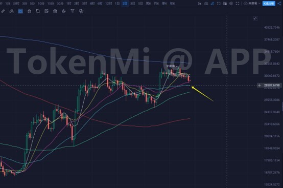 并没有我们幼想的那种直接换血反扑,因为这个阴线的实体的缘故,2日线级别上就存在继续往下踩的可能性,从均线回踩关系来说,此前回踩过绿色86线,那么接下来如果回踩一般淡蓝色43线就应该是支撑,也是我们月初判断的比较弱的玩法,就是回踩季度线均线支撑的中间状态。目前紫色28线还在支撑,撑得住就可以继续消耗或者反弹,撑不住还有向下踩的情况,大约就是29000一线。整体市场波动并不大,大家不要太在意了。