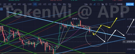 明天早上8点5日线收官,如果有动静就今天把阴线实体变成长下影那么会好很多,如果不能涨,那么就要看按照以往三阴换一阳能否实现,能的话还是不错,不能就还会继续消耗,整个8月上半月估计都不咋地。目前形态复杂的地方一个是我们 这几天一直强调的时间周期混乱,各个周期线都各自为战有自己不同的收官时间,一个则是环境上美联储加息与否的不确定性,以及随着市场规模越来越大监管方面也在不管的折腾,导致环境相对并不是那么容易搞事情。这就导致市场只能在一定范围保持相对震荡,这种个相对震荡就是各个形态之间的不断转圜,比如白色M头和黄色头肩底以及后续走势的红色类似双底或者上升三角等等。主力既然愿意作图去横盘等待而不是杀跌,那就说明想搞事的心有,但环境上或者实力上积蓄还不够需要等待观察。至于后续的选择情况,从主观来说老K这个死多头不用重复了对吧,客观来说横盘震荡等待本身就包含涨跌横三种状态,我们作为市场参与者并非主导者,只能耐心等市场做出选择,其他的不需要多思量。