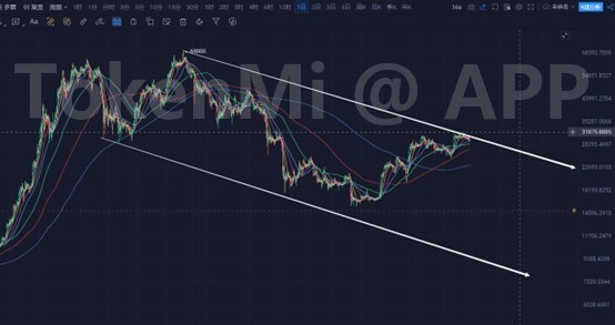 可能很多人没意识到这一点,那就是随着时间消耗过去,目前价格在69000美金下降大通道上轨这里承压了。按照一般的调性,都会有一个突破动作刺破阻力,然后再跌回通道内来纠结消耗一些时间,然后再重新突破,这个事情在此前的行情里也出现过。放大局部: