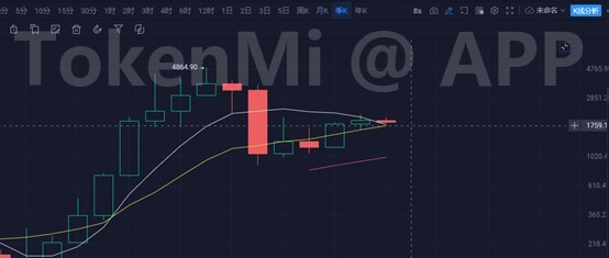 以太坊的月线比较复杂,这货波动率太狠,一般是大饼的双份,所以导致它的形态细节非常难把握,难度比大饼更大: