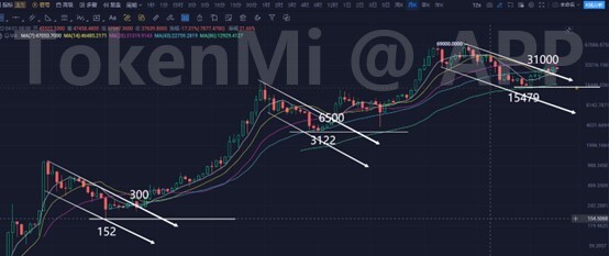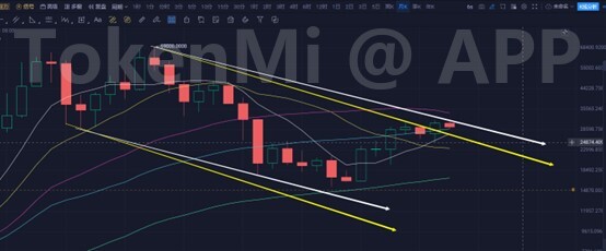可以看到整体上大饼的月线,已经横盘四个月,纠结在黄色和白色下降通道上轨一线,能突破皆大欢喜,不能突破还需要反复,但是从历史走势来说,月线级别的下降通道一般都是直接突破不会反复的: