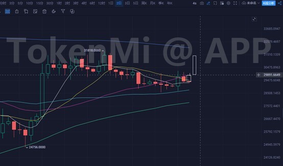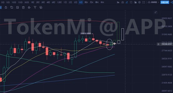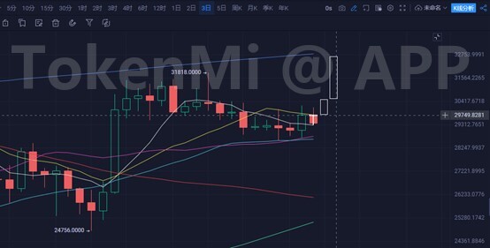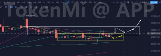 由于昨天已经呈现连阴,所以从拉盘时空配合上,最好的方式就是兼顾多周期今天收一个类似昨天阴线的阳线,把市场稳定在白色方框29700-30800之间去震荡或者拉盘安全度会高些。如果今天继续收阴,则市场不止要面临黄色28800-29700震荡安全度降低的问题,甚至还可能一个控制不好就容易出大阴线直接进行季度线7线回踩并且把震荡时间大大延长的最差局面(相当于当下构筑的这些震荡中心点都不是绝对核心,双底头肩底都不成立,创立新的中心点):