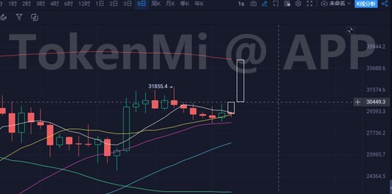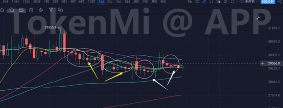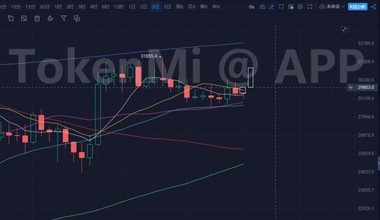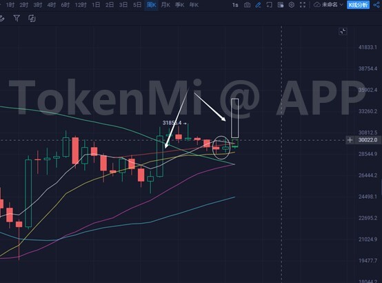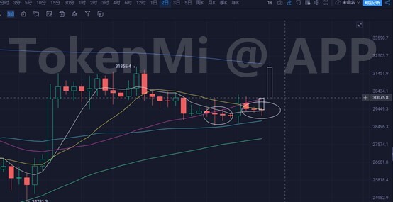 因为是类似5日线的2K幅度差不多十字星震荡,所以当下只需要满足最低需求到3字头和左侧阴线对应就算是双底构筑底部成功,后续可以拉盘也可以再震荡但是是在29700-31500之间震,也可以做上图对应大阳线拉盘,看主力选墨迹还是包里的方式。