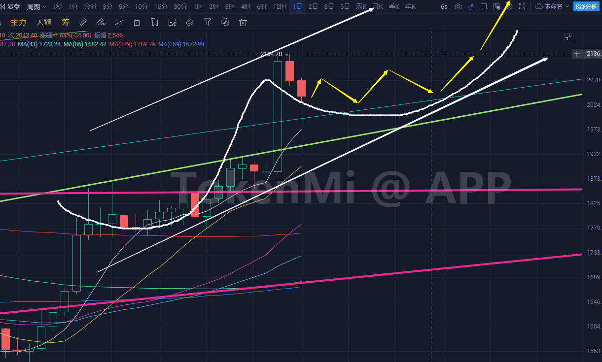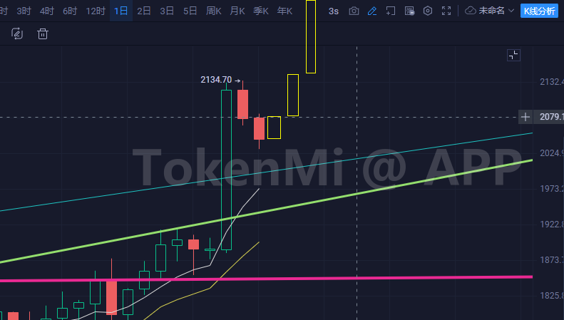 市场的话大饼是可以冲的,但以太的走势就是明显不想冲,那么综合考虑大饼相对震荡以太玩阴线实体,然后明天以太阳线并列今天实体为下周继续上涨做准备,可以理解为就是消耗点时间。形态如下图模拟: