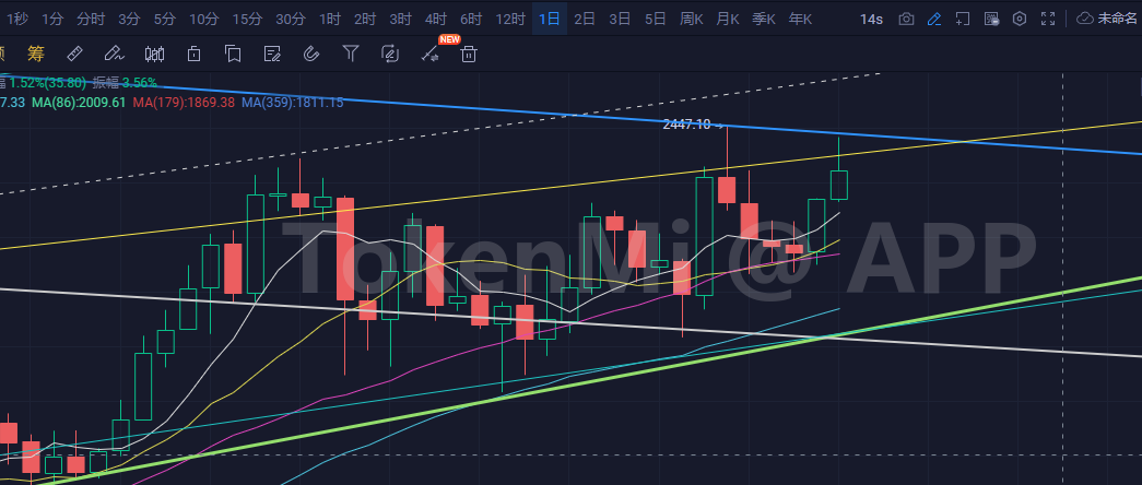以太没有突破压制,大饼今天没有踩过短均线,有波动很正常,几百美金而已,蛋定啦,明早给你们写一篇文章各个级别给你们捋一遍就有谱了![[好的]](https://img.tokenmi.com/emot/qq/141.png)