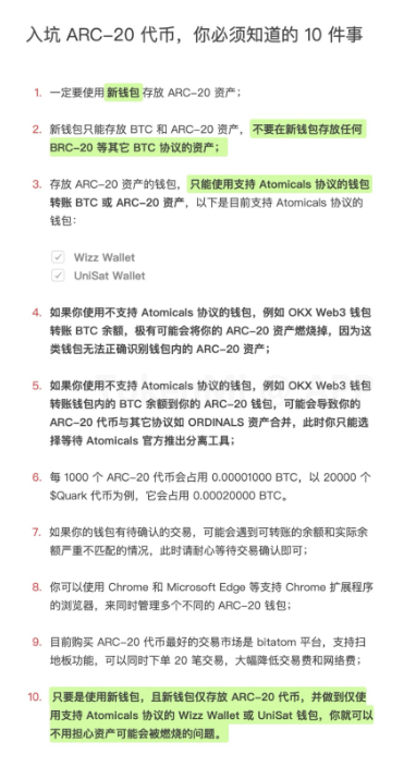 ARC20的代币的优点ARC20 完全依附比特币的UTXO模型,BRC20 以546聪来打印1000ord或者 1亿sats的做法在这上面被弃用,取而代之的是1 sat = 1sat的染色硬币的做法。任何的一枚 ARC20 都有1枚sat真正的背书,1 atom 1pepe 都是1sat,做到了真正的“金币”,而非纸币。另外arc20的去中心化索引器和钱包可以无缝运行,协议方声明这个标准是比任何以太坊/EVM 解决方案以及之前的任何解决方案都要优越的模型(有待验证)。