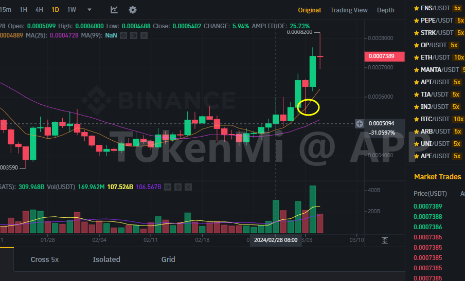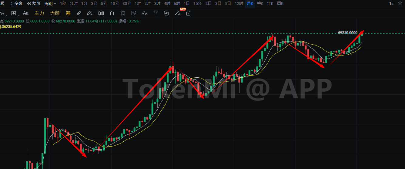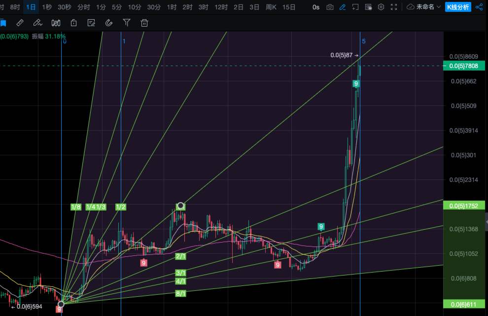 说起来,我记得2021年,比特币突破也是经历了这么一个阶段,当时狗狗币也是疯狂上涨,突破之后差不多涨了120多倍。我经常讲,历史不会简单重复,但会押韵,今年这个韵就压在了pepe这个品种上,如果硬要刻舟求剑,在现在价格基础上,再涨个20-30倍不是没可能啊,只是走势没完全出来之前,没几个人真的敢相信。