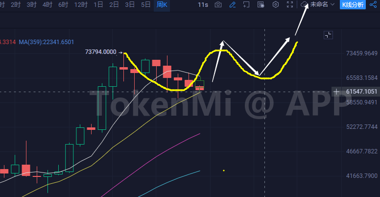 周线级别来说本周继续收阴的概率相对低,收一个类似上周幅度的阳线可能差不多,然后如果要震荡,那么就是类似上图做一个W形态等待三季度的突破行情。