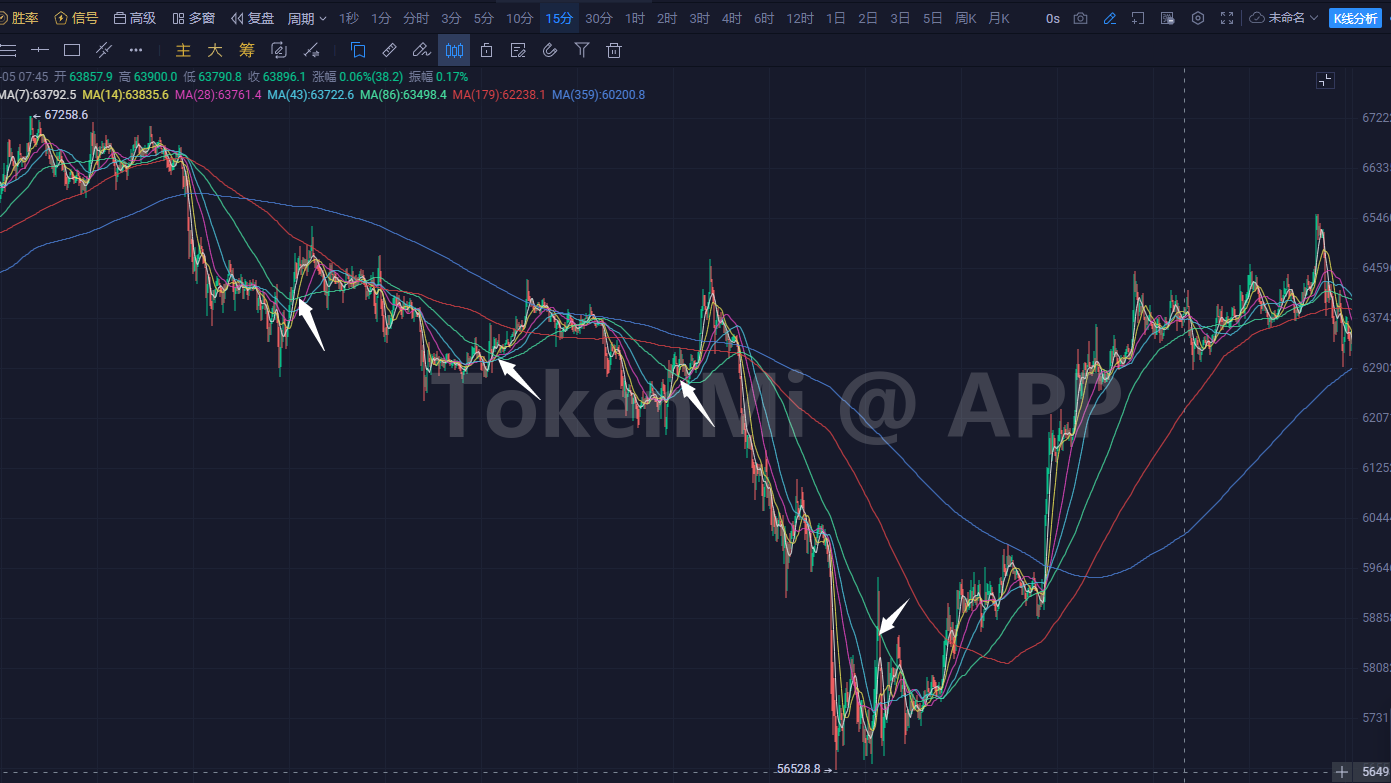 比如放大到15分钟级,我们可以回顾前面那一波也是一样的,也是试探了4次才成了,前面三次都噶了