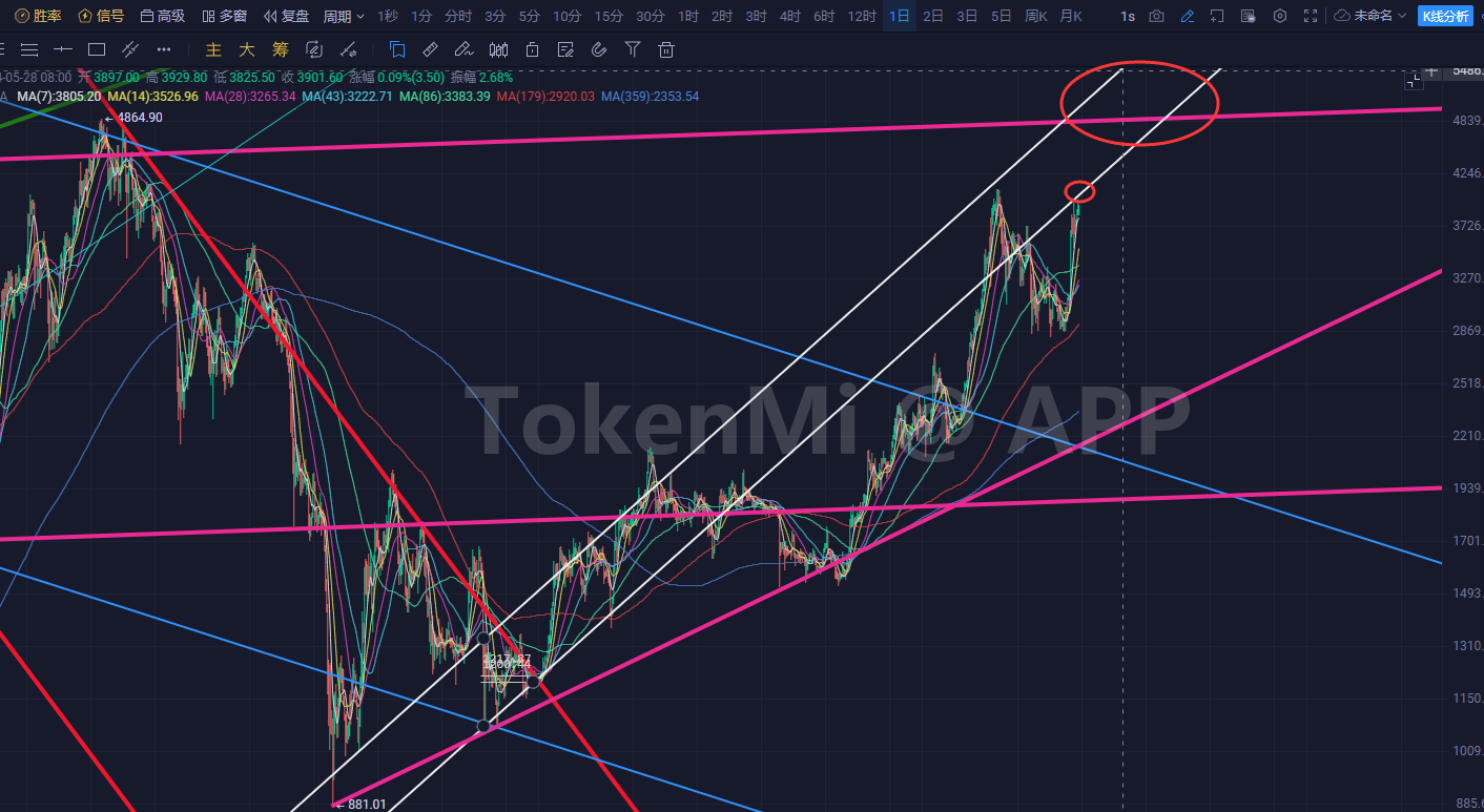 以太坊的这个形态其实没有什么退路的,它不能再横盘因为震荡范围太大,横盘时间会太久,所以它基本上只能继续上行去挑战阻力,在阻力附近才可以振,也可以持续的突破加速,但就是没有跌的选项,所以不要老是一天天的自己吓唬自己,很多时候要多给自己信心才能拿得住。