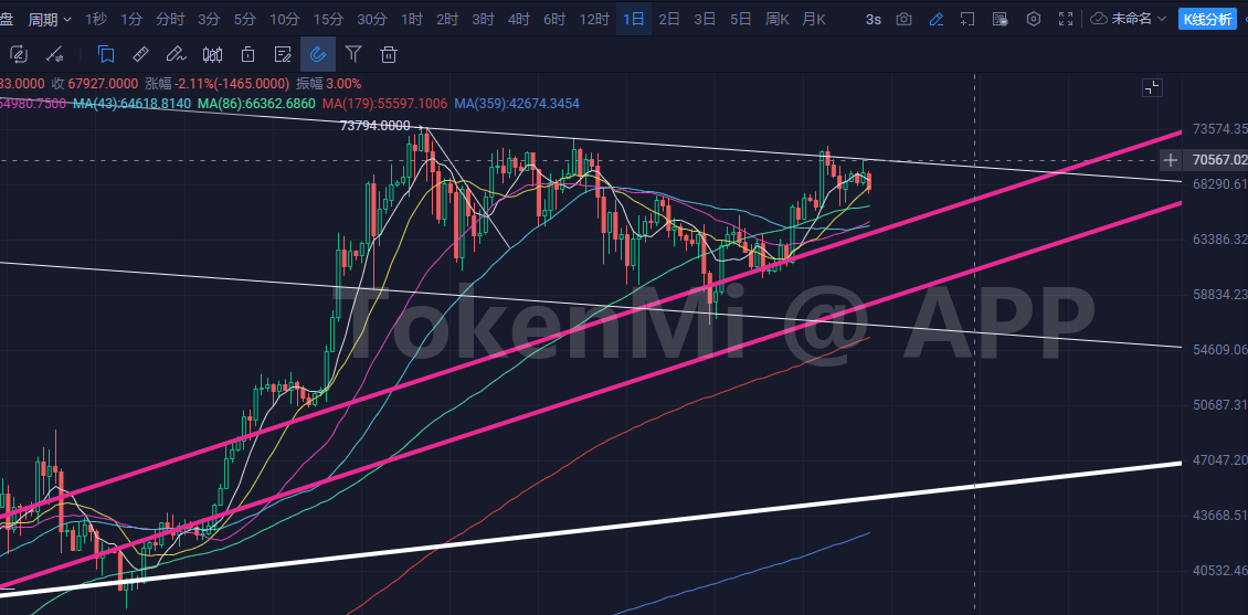 大饼的震荡通道没有突破所以没有加速,前面突破没有站稳,昨天第二次试探没有上去,今天还是震荡状态,只有突破这个震荡区才有加速,没突破之前都是玩泥巴,随它就好,不必在意。![[旺柴]](https://img.tokenmi.com/emot/qq/140.png)