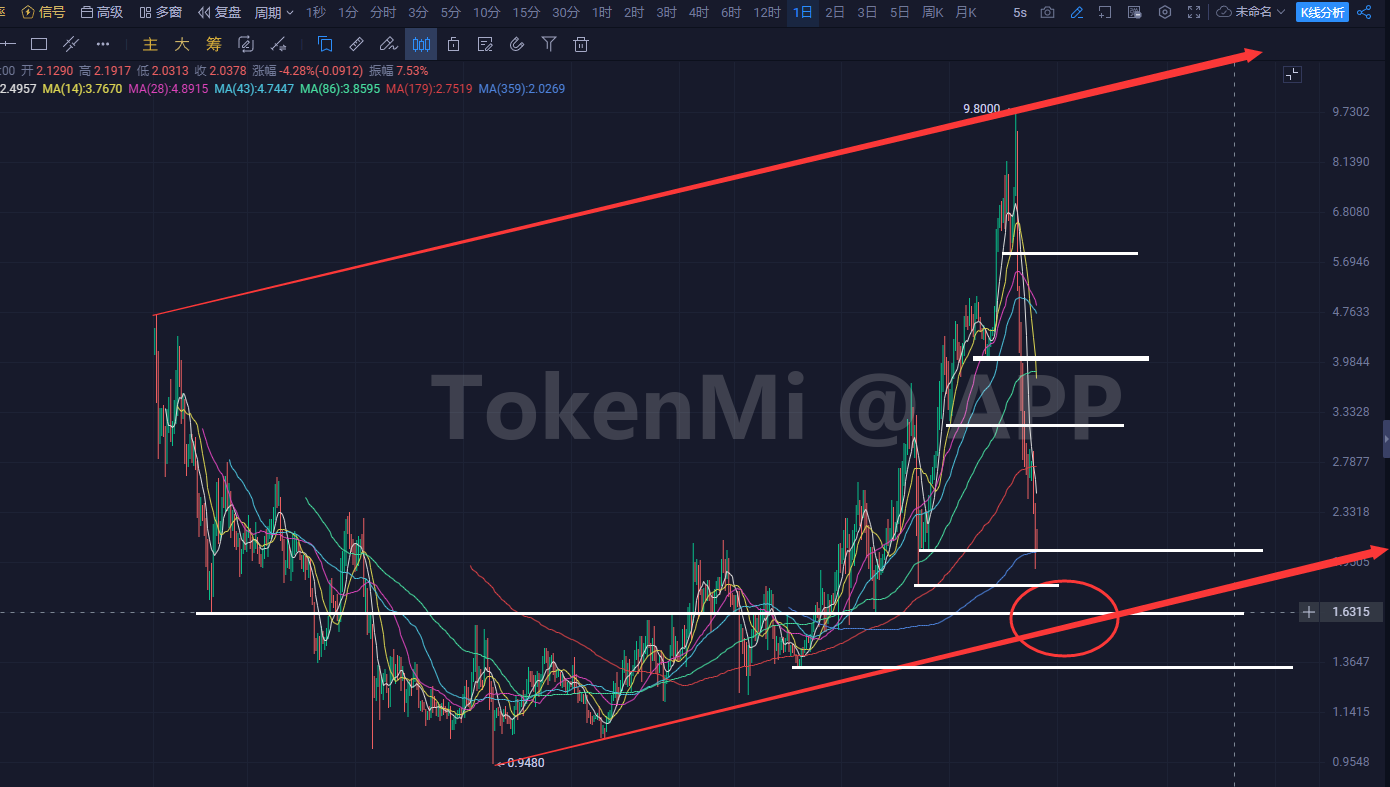 如下图,每一个位置都可以成为底部,只不过影响的级别不同,当下所在的1.6-2.3就是影响最大的底部区域,但底部不是一个价格是一个区域,当前价格处于最后的区域中,也许是这个价就够了,也许还会到极限位置,这是不定的