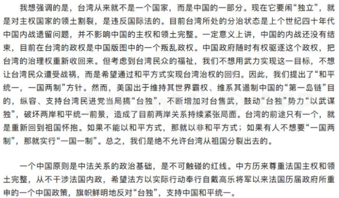 中国驻法国大使卢沙野最近演讲中称,中国内战尚未结束,目前的台湾政权是一个叛乱政权。“如果有人不想要‘一国两制’,那就实行‘一国一制’。”