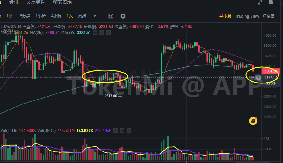 ETH,如果按不住,3300,肯定就要回到3000一线震荡。