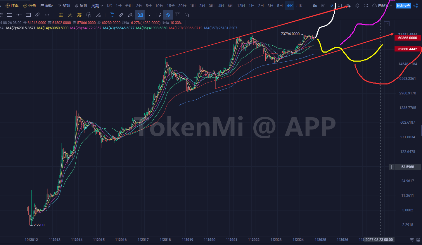 没有别的路径,就算是稍微次一等的紫色线也意味着26年之前都是废的,这上面这些都还不是最糟糕的结果,最糟糕的结果是双顶或者三重顶然后真的进入寒武纪