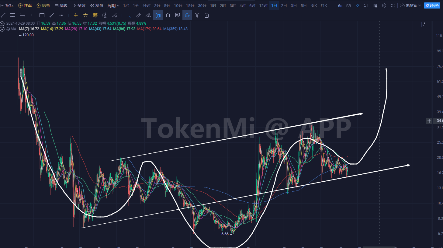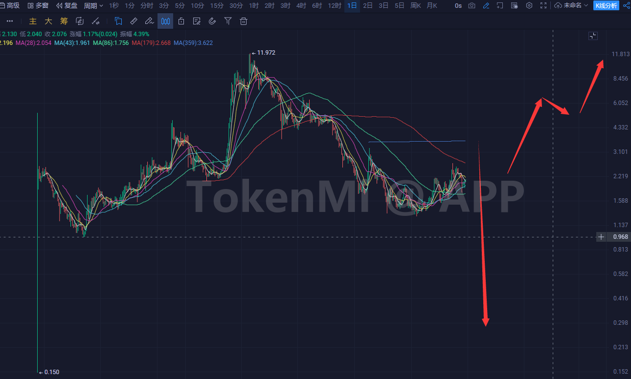 上面那么大的虚线,对山寨来说,高点回调十倍那是基操,目前还在横盘,也许是想等风来飞一波,所以可以持有