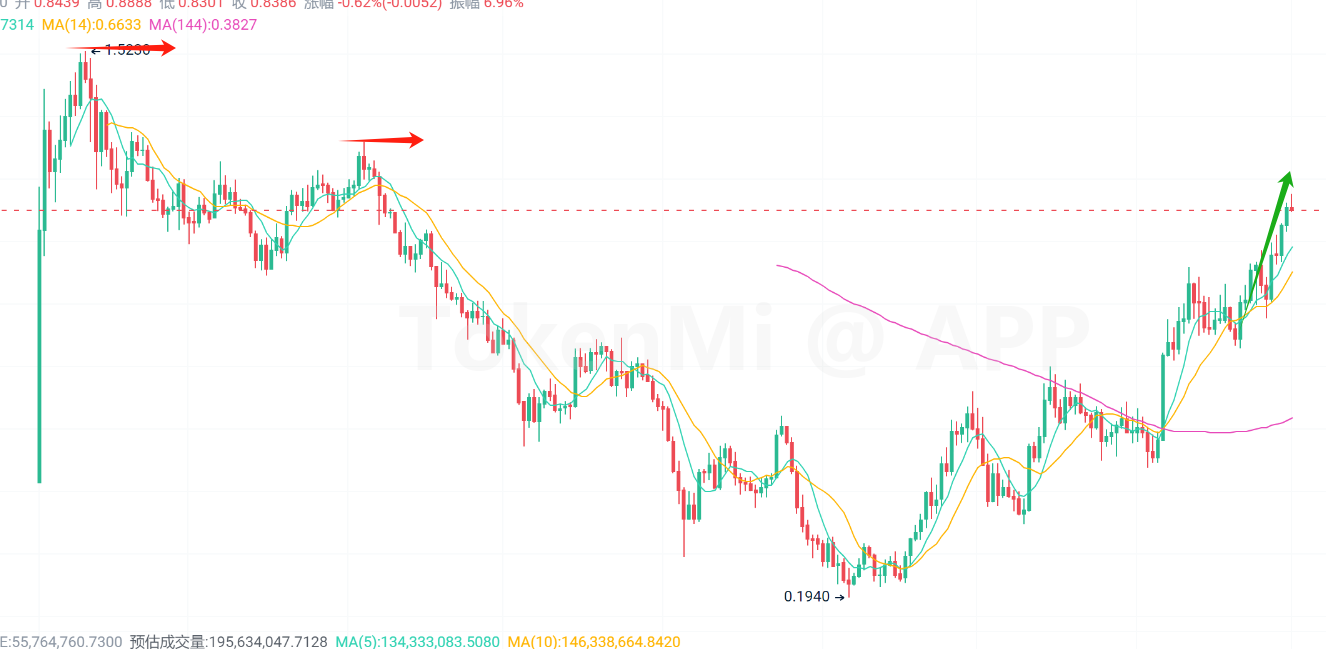 这个币我感觉也一般,开始没涨多少,一直跌,好币一般不会这样走,目前1刀,1.5刀都是阻力,长拿不是很好我觉得,稳健操作最好是在目前日线拉盘阶段这次涨完就止盈,现在应该还没完,但是再往上点最好就要止盈换其他币了