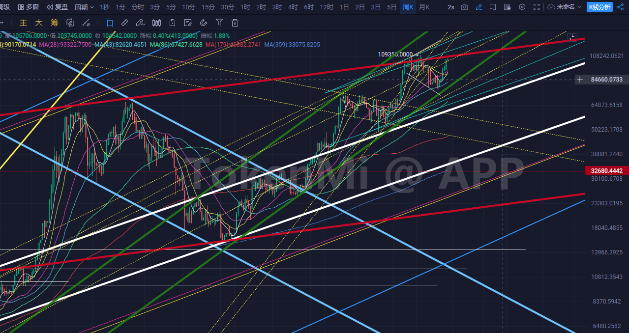 预判不了的胖桑,为啥呢,其实很简单,周线级别上阳线实体和均线之间有了空间,那么它就可以有两个选择,折腾一根线等等均线或者直接加速,能理解不咯?