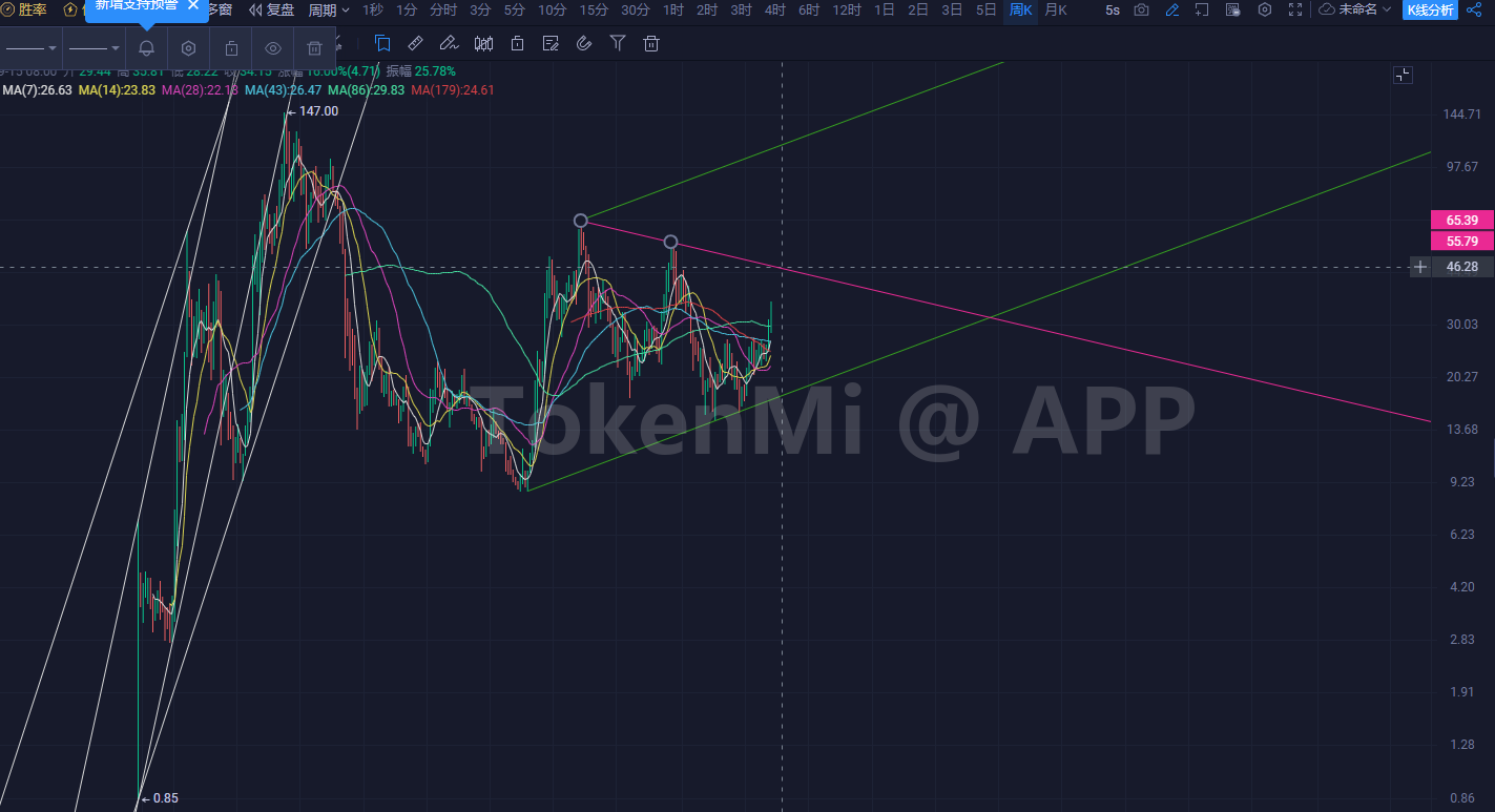 我看成aave了,先看47能不能突破,这是三角上轨压制阻力,能突破则看绿色通道。