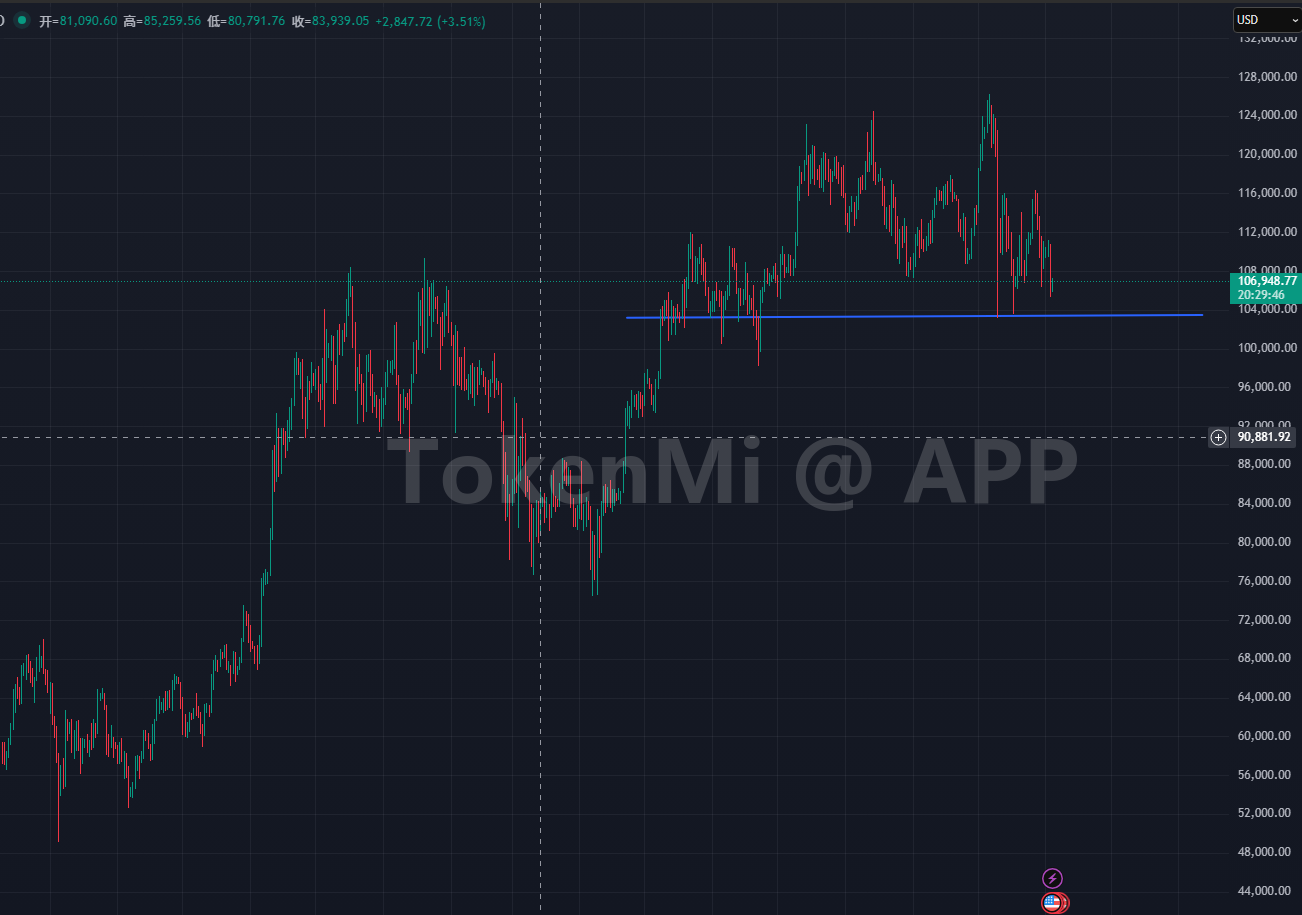 比特币还在震荡结构中,只有跌破10万,才能判断是否是中期调整。