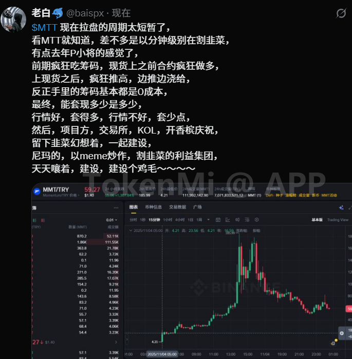MMT怎么虐韭菜的? 币圈真是神奇 涨了也有人骂 跌了有人维权 不涨也有人割肉 分三步 1. 在币安alpha开池子阶段疯狂吸筹 2. 在盘前合约转换之后做超额多单 3. 控筹率超过100%之后,把手上的钱都打进去 最终 在一片烟花爆竹声中 收获自己的80个m