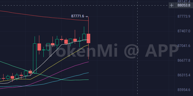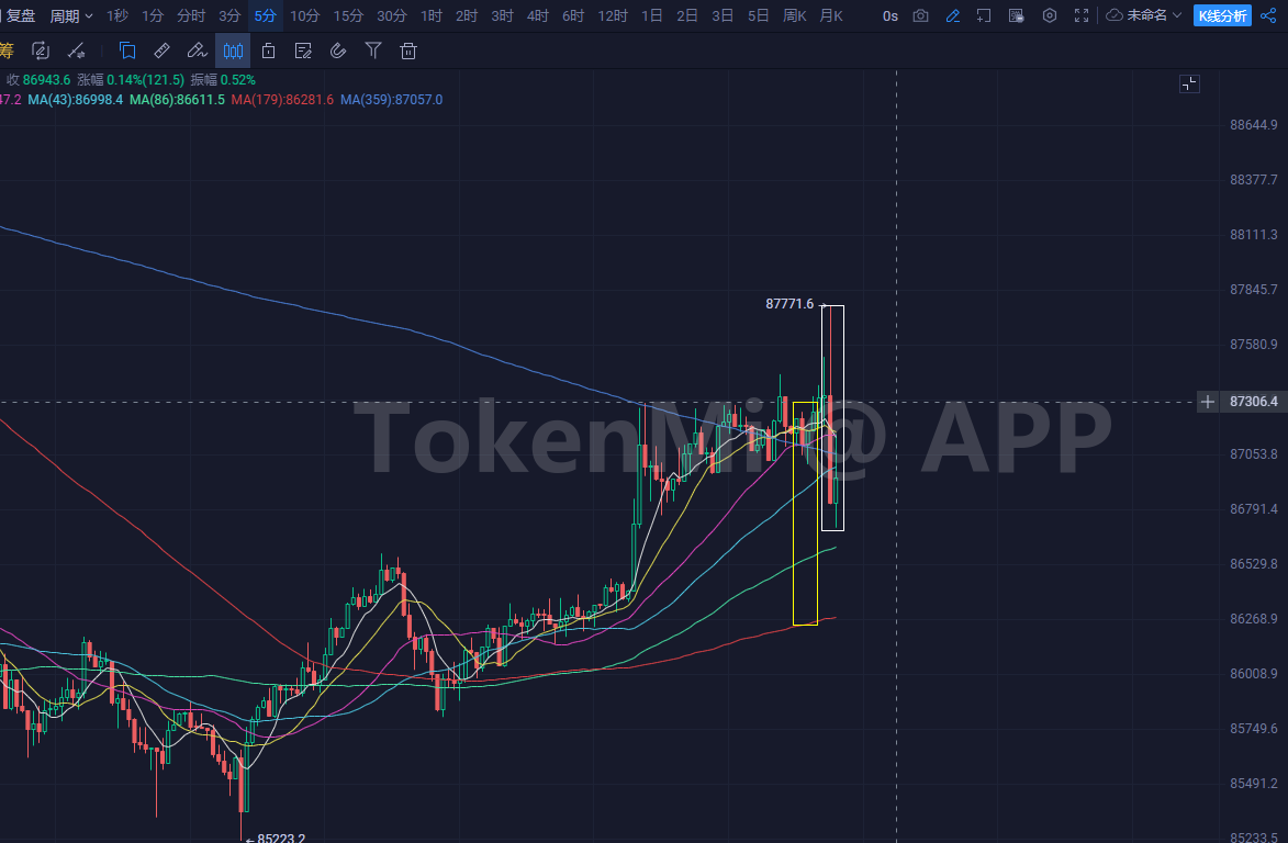 而且以往的打针都是比较瞬时的动作,打完针总会有个相对平静的时候,今天到目前为止这个躁动持续了两个小时了,从突破87300开始就变得诡异,既然做空被噶了,那就换到多军试试