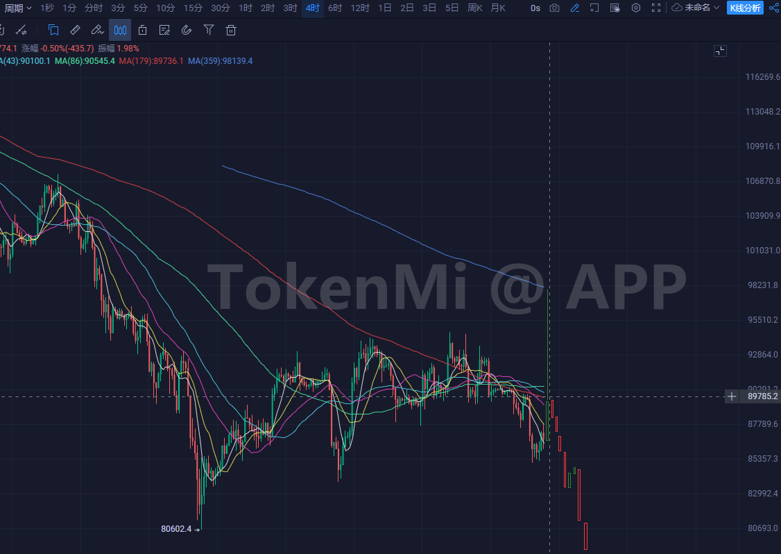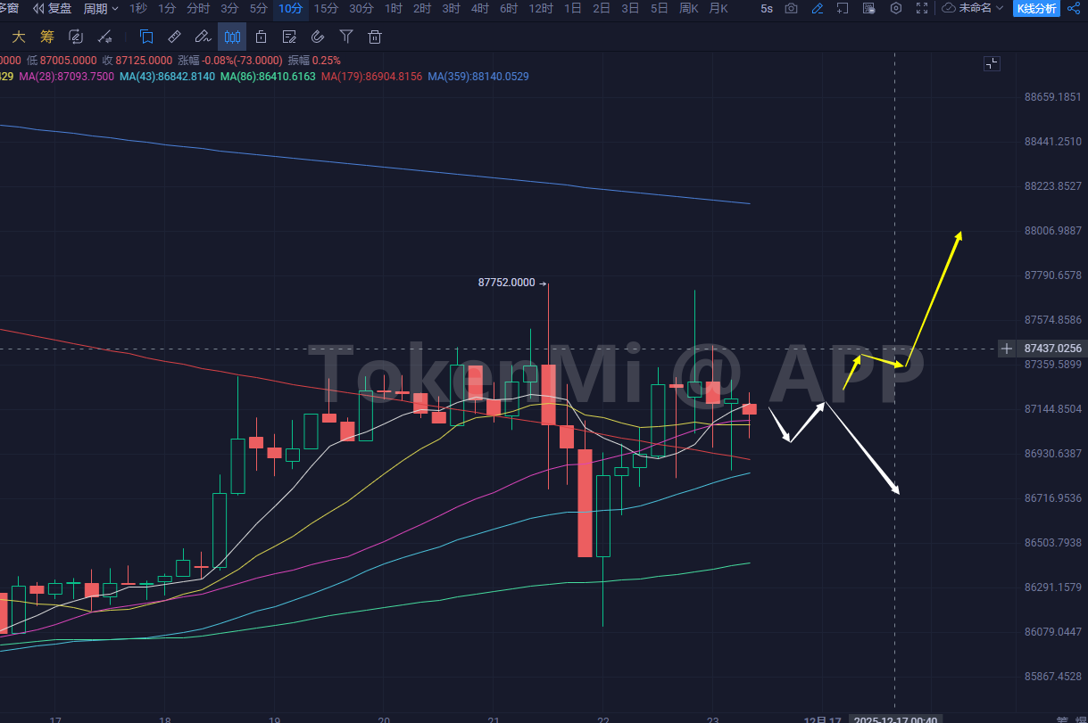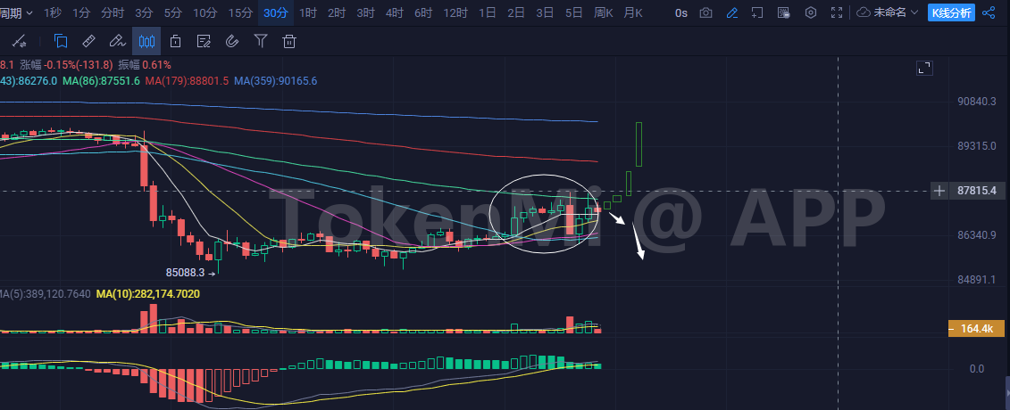 以太就差30美金到相对支撑了,它乱跳很正常,大饼85可以算支撑但也可以不算,正常来说拉线行为,要继续往下磨一磨,快跌结束之后是慢跌磨。但今晚突破873就显得不正常,因为如果要继续跌的话这个位置不应该突破的,而突破之后整个个市场就很乱,一直分钟级几百美金上下持续了两个小时,这是不正常的,下方相对有支撑,上方有引力,而且盘面上看虽然一直在乱跳,但是向下的那根针之后再也没往下试探反而是一直在朝上打,就像一个不断往上顶的打桩机,这种情况下,我觉得不能再坚持觉得还会下行,有可能会走极端情况向上释放一下。之前比如昨天不能往上,一来是下跌信号,二来则是更大级别上比如2日线3日线5日线周线这些向上的话下影线没有做出来光一个实体不合理,经过昨天今天的折腾下影线部分出来了,如果再上去形成阳线实体形态上就相对合理很多。至于其他的先不管了,死后洪水滔天那也是死后的事儿,反正目前我这个小空军随着刚才这持续2小时的上蹿下跳随着87300被突破,随着刚才那根向下的针没有再试探反而试探向上的针,我,叛变了短空军,重新回到我大多军阵营。
