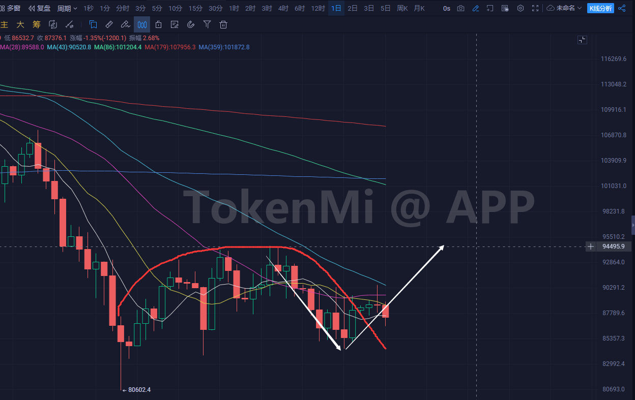 如果把80以来的图形已经做出来的部分看作是一个圆弧顶,那么当下这个细节动作,可以算是圆弧顶右半部分和头肩底或者V型反弹的左侧部分的结合