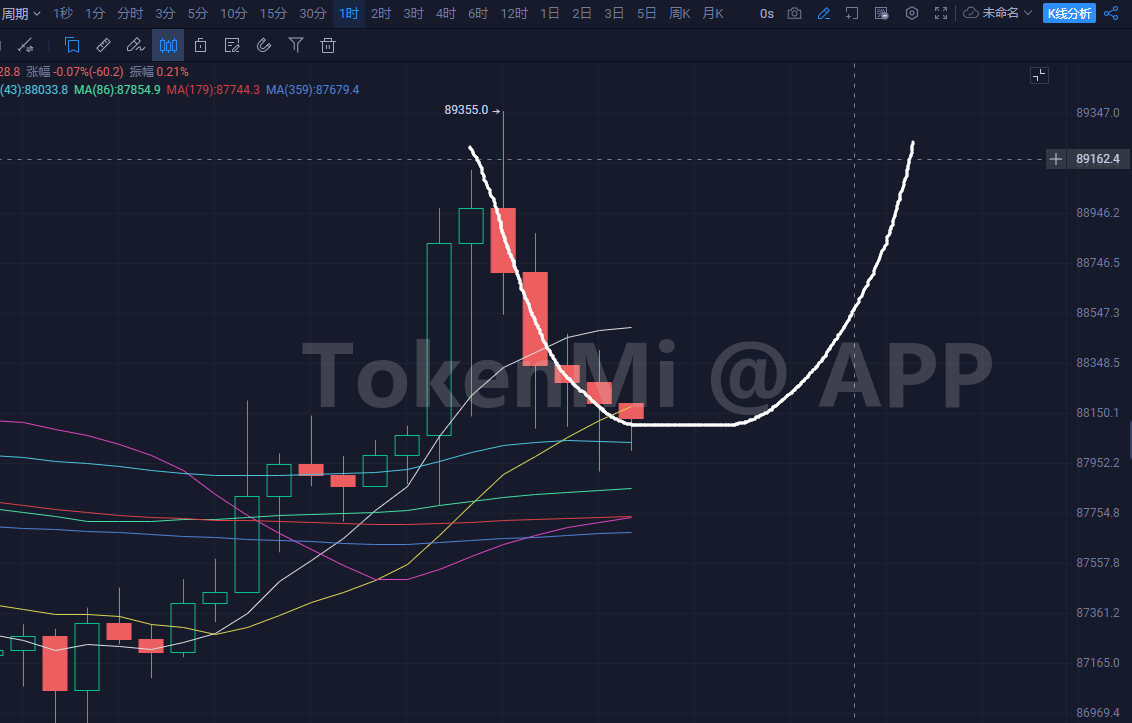 大饼小时图下跌的幅度在缩小,保持这个姿态的话后面还可以圆弧回去的