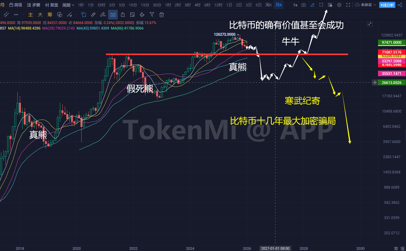 只有这一种解法是不熊,其他的都是熊出没,而熊出没后续也有两个路,一个还有一波牛市并且非常秀,造化钟神秀的秀,一个就是加密货币被证明是骗局或者说不可持续然后逐渐走向消亡