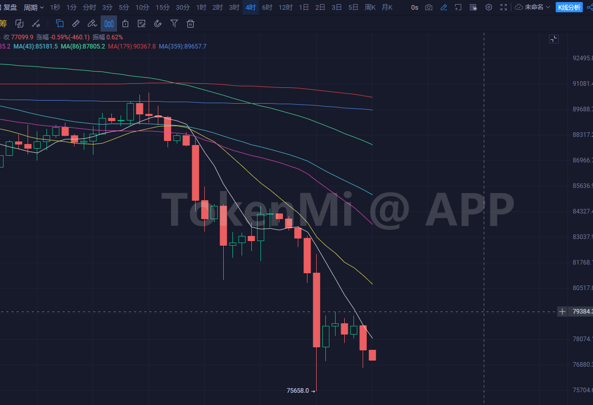 这么喜欢做多啊,喜欢做多的626一线再做,现在4小时黄昏星跌的概率更大,你可以在市场靠近78一线的时候以79381美金为止损做空会更合理