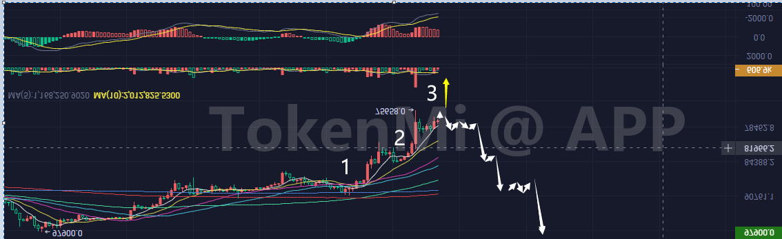 正着看不清反过来看,第三段可以有可以没有,目前看有的概率大,如果木有的话,这里75555位置就类似前期97700的位置是一样一样的,有第三段那么今明两天就要出现,如果不出现那么就可能呈现相反效果,目前震荡得头晕,我也不知道有没有第三段![[汗]](https://img.tokenmi.com/emot/qq/134.png)