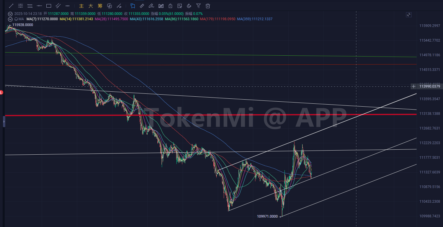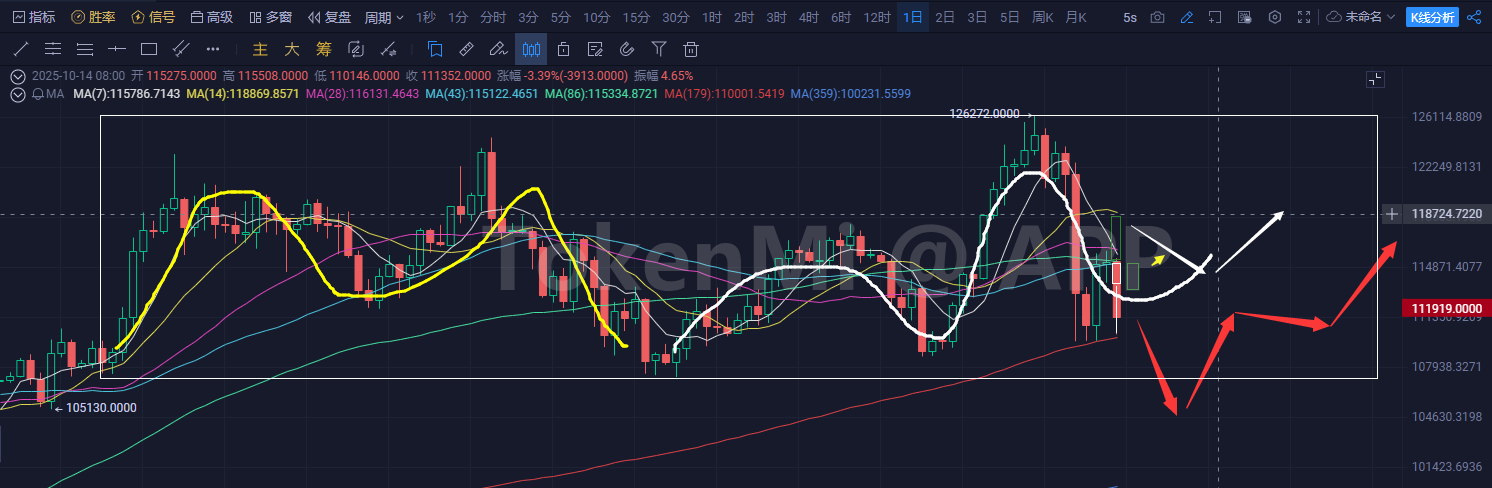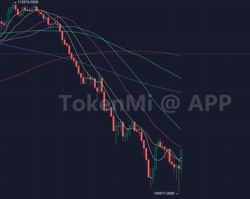 分钟级别赌狗这里可以试试,也可以稳健等1105的时候试,但今天后半夜的走势至关重要,日线一定不能收这么大实体的阴线,至少阴线和下影线的比例要保持在1:1或者没有实体都行,但就是不能收这么大阴线实体,收这么大阴线实体只有一个结果那就是还要继续往下窜,去试探107000一线的支撑
